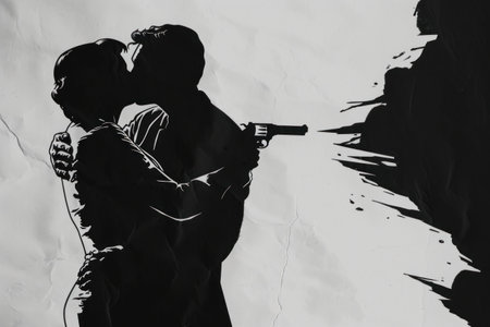 A passionate kiss between a couple, one holding a gun, set against a crumpled white background The dramatic contrast enhances the intensity of the moment