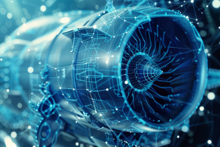 A blue jet engine with a lot of lines and dots. The jet engine is very detailed and looks like it is made of a computer program
