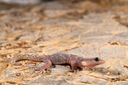 Close-up young gecko (Tenuidactylus caspius) sits on the stone and looks down.