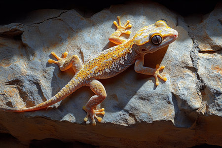 Yellow gecko basking on rock, sunlit background, wildlife photography