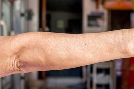 Freckles senior asian woman on her arm,Wrinkle,Selective focus