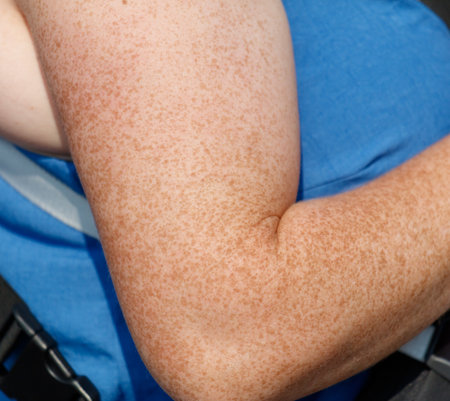 Close-up of a young man's arms and hands showing freckles and pigmentation, highlighted clearly against a white background.