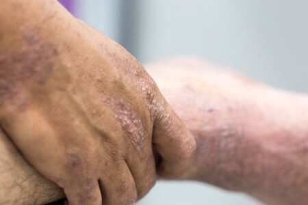 Allergic rash dermatitis eczema skin of patient. Man itchind skin with psoriasis