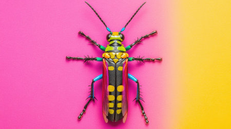 This stunning macro photography captures a vibrant insect perched on a bright pink and yellow background, showcasing intricate details and vibrant colors.