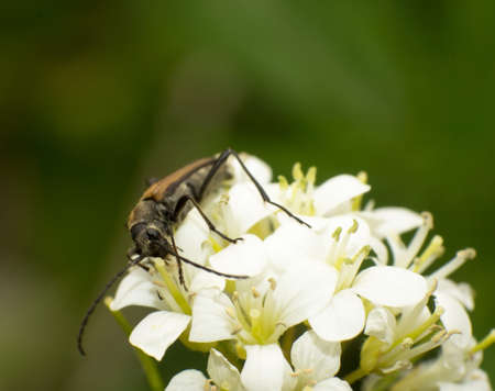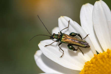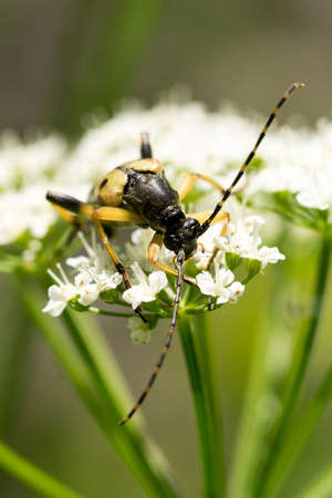 Black and yellow spotted longhorn beetle climbing on a white flower growing in a meadow. Natural light and blurry green background.