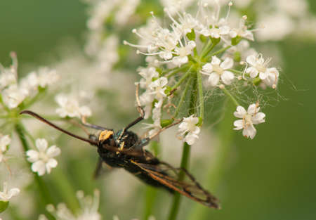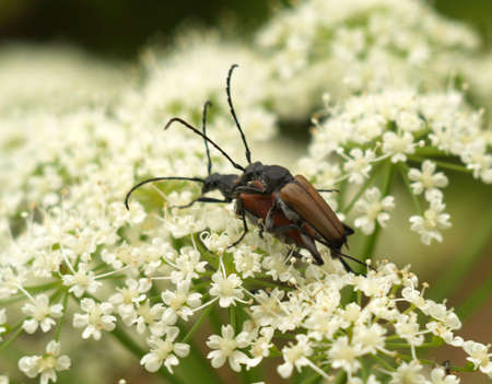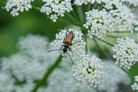 Closeup on a Spotted longhorn beetle, Leptura maculata on the white flower of a Wild carrot, Daucus carota.