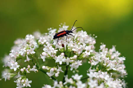 Red-black longhorn beetle (Latin: Purpuricenus budensis) on white flower on green leaves background, close up.