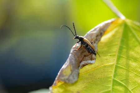 A Red-brown Longhorn Beetle ( Stictoleptura rubra ) on a leaf with many copy space