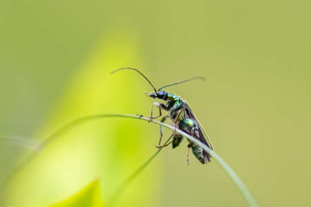 Swollen-thighed beetle, Oedemera nobilis, insect on a green background