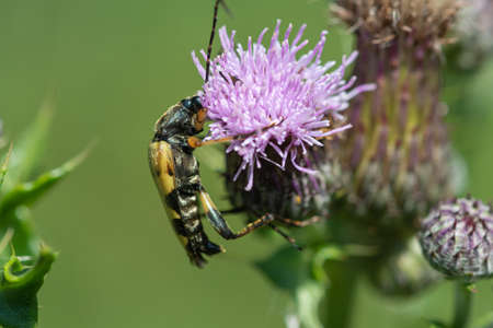 Macro shot of a spotted longhorn (rutpela maculata) beetle on a thistle flower