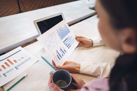 reports and histograms on paper on the table in the hands of a girl, analytics and statistics on paper, business analytics