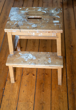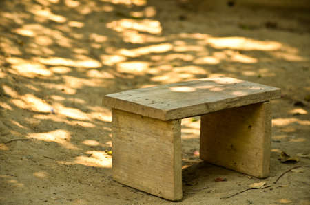 A weathered wooden stool sits amidst debris, showcasing its rustic charm and aged texture.
