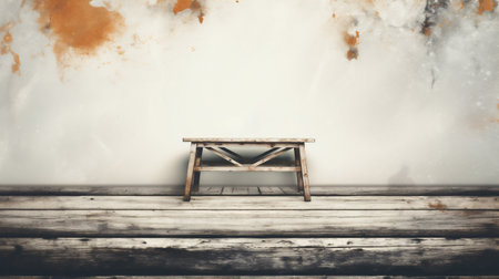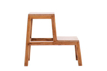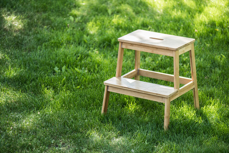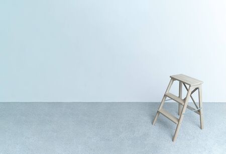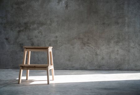 Empty wooden stepladder chair in the studio over concrete wall background with sunlight from one side
