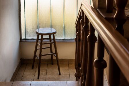 Old wooden Bar Stool in a Wooden Staircase with Handrailing in an Old house. Interior Decor of old Stairs. Old House Design Detail with Bar Stool and Stair Case with No People