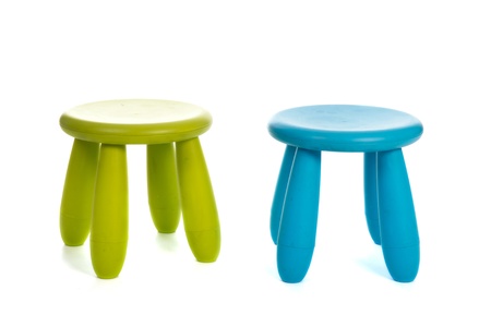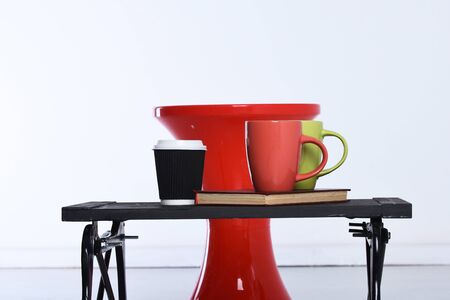 red chair and black wooden tray with red green paper cups and book on it on white background, copy space