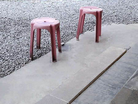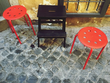 The black metal stool is near street restaurant on the ground. The small chair stands on the sidewalk at street night market.