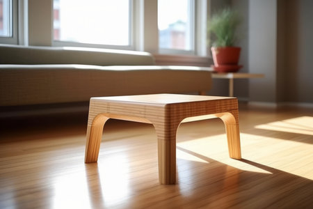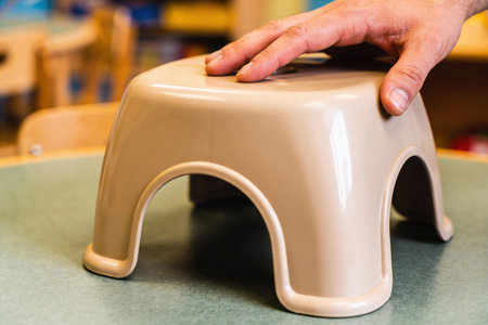 A close-up shot shows a hand gently placed on top of a small, light brown plastic step stool positioned on a speckled green tabletop