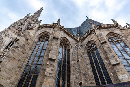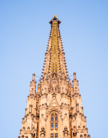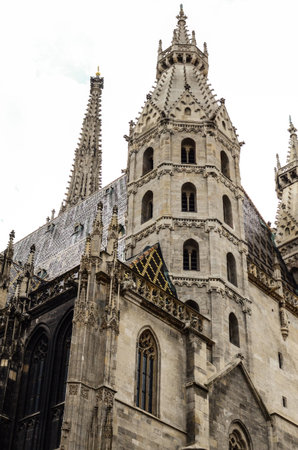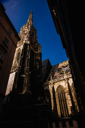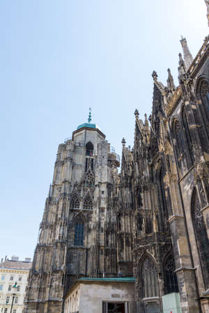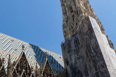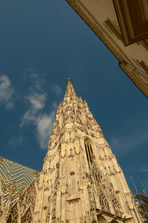 Vienna, Austria - June 2022: Detail with the gothic tower of St. Stephen's Cathedral Medieval Roman Catholic church located in the center of Vienna.