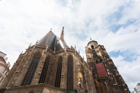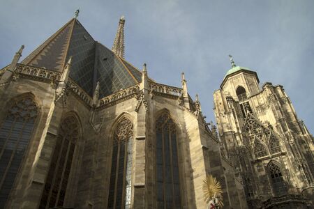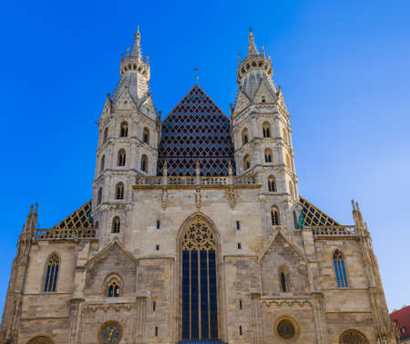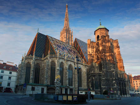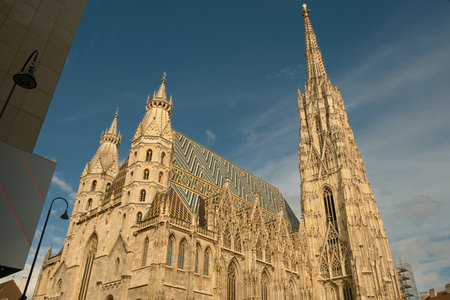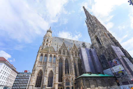 cathedral towers medieval architecture religion building exterior facade urban view in Vienna capital of Austria central European region twilight lighting and blue sky white clouds background
