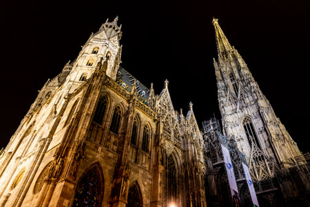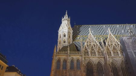 Vienna, Austria - October 30, 2019: Bright light shining on old building of St. stephen's cathedral at night.