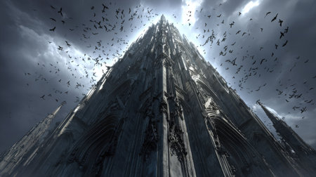 An imposing skyscraper dominates the frame, its textured surface reflecting a dramatic sky filled with dark clouds and numerous flying birds. The image employs a low-angle perspective, emphasizing the height and imposing form of the building. The lighting creates a contrast of light and shadow, hinting at a cinematic or fantasy context, suitable for various editorial and promotional purposes.
