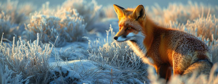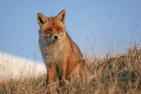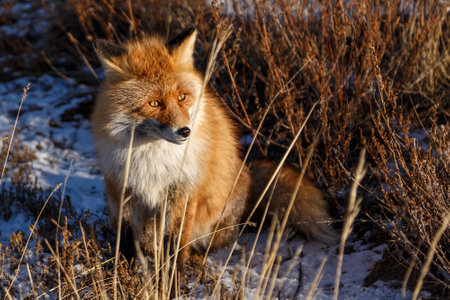 Siberian red fox sitting among dry grass in a field in winter