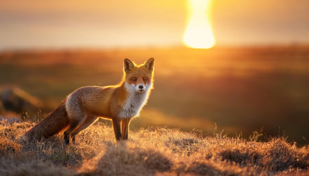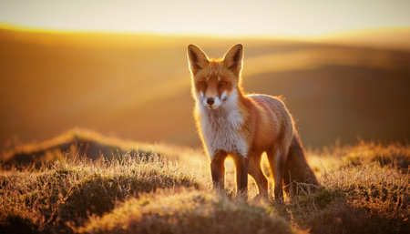 Red fox (Vulpes vulpes) on a hill at sunset