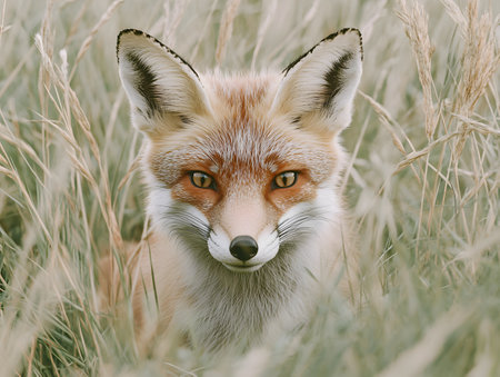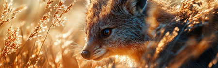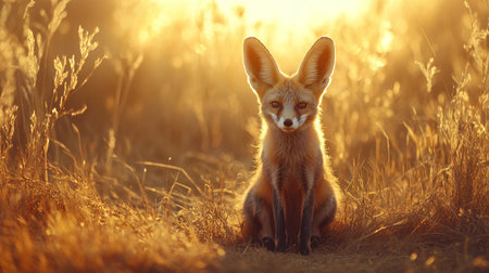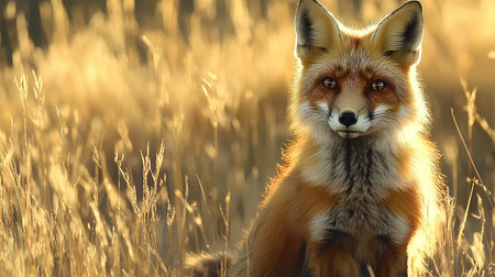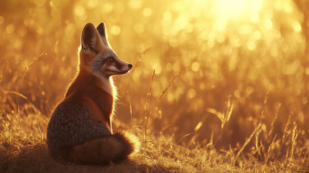 Red fox (Vulpes vulpes) sitting in tall grass at sunset