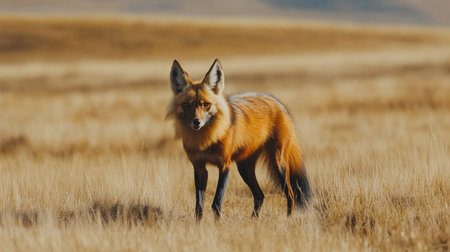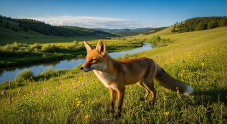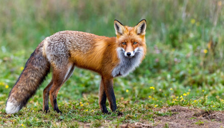 A natural view of a wild fox on grass field