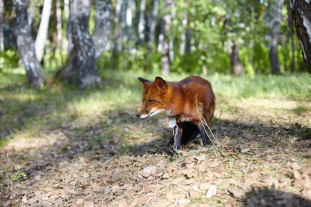 A red fox walks along a dirt road in the summer in the forest.