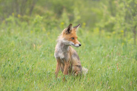 Red Fox Vulpes vulpes. A fox is sitting in a meadow looking at the camera.