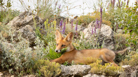 Portrait red fox cub Vulpes vulpes in the wild.