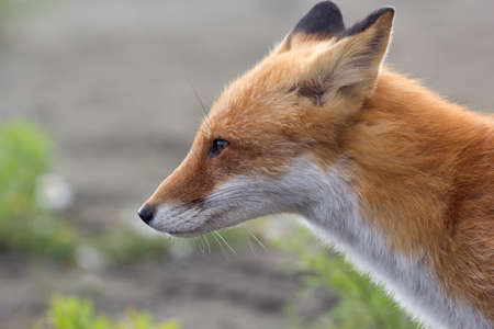 Portrait red fox Vulpes vulpes on a beautiful background, in the wild. The fox looks attentively into the distance.