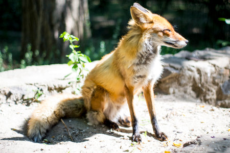 Red little fox in the forest. Home fox in the park