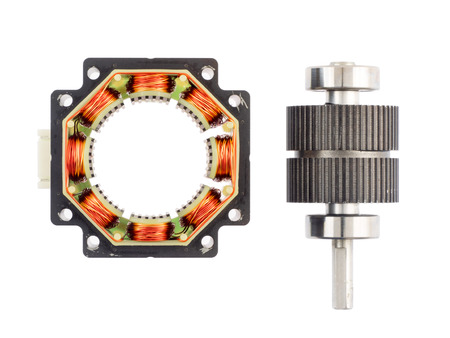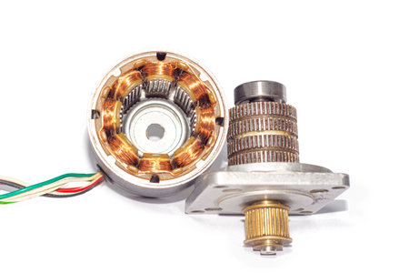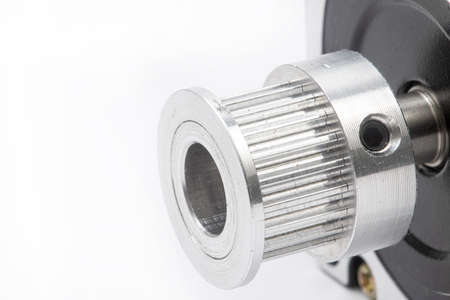 Deconstructed parts of electrical stepping / stepper motor isolated on white background. NEMA standard flange motor for driving axes of CNC machines.