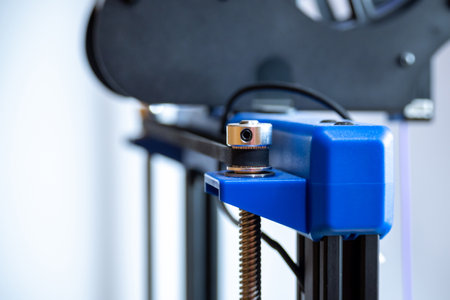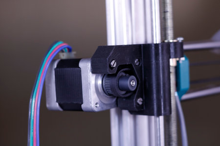 Stepper motor which drives heating bed in front and back directions with belt on its shaft close-up