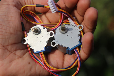 Back side view of a hand held step motor module. This module is used for electronics hobbyists for DIY materials.
