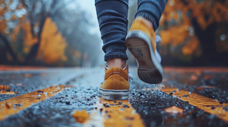 Feet sneakers walking on fall leaves outdoor Autumn season