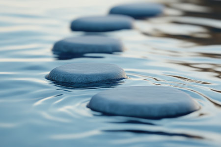 Stepping stones floating on a calm water surface, creating a tranquil and peaceful atmosphere