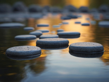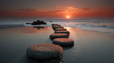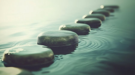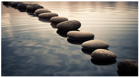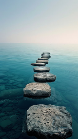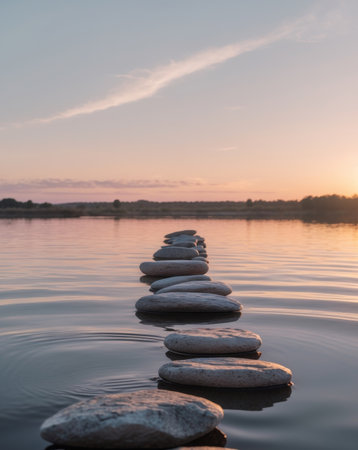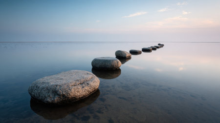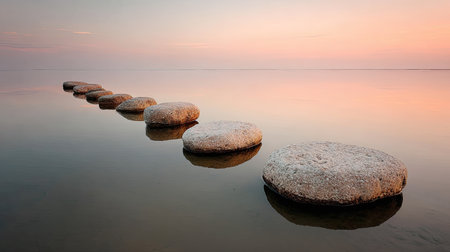 A row of smooth, dark stepping stones crosses calm water during a soft sunrise, creating a path toward the misty horizon. this tranquil scene suggests concepts of progress, meditation, and balance.