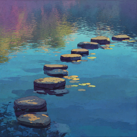 An illustration presents a serene view of a stone path traversing calm water. The artwork features circular stepping stones in the water, reflected. The color palette includes shades of blue, purple, and yellow, suggesting a tranquil daytime setting. This image could be used for various visual projects related to nature or meditation.