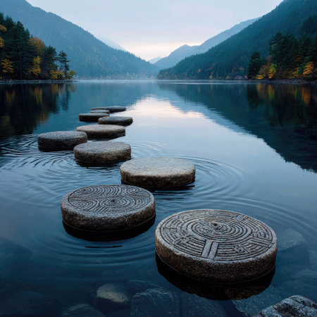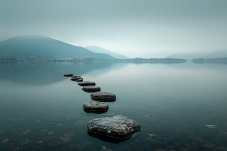 A tranquil image showcases a stone path across a serene lake, leading towards distant mountains. The composition highlights circular stones set in the water. The lighting suggests a day scene with the soft glow reflecting on the water's surface. The image is suitable for various commercial and editorial purposes.