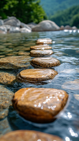 Smooth, rounded stones create a pathway across calm, clear water in a serene environment. Sunlight reflects off the surface, enhancing the peaceful atmosphere and natural beauty.