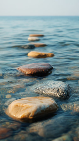 A serene pathway of smooth stones extends across calm water, creating a tranquil atmosphere under a gentle sky, perfect for introspection and escape.