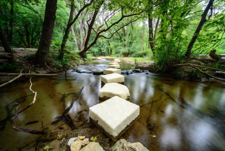 A serene and peaceful forest stream with stepping stones and lush greenery