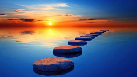 Tranquil sunset scene with stepping stones leading out across calm water, inviting a peaceful and serene journey to the horizon.