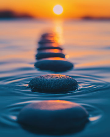 Smooth stones form a tranquil pathway across a serene body of water at sunset, reflecting warm hues.