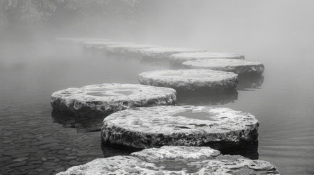 This captivating image showcases a serene pathway of stone slabs emerging from still water in a foggy morning landscape, inspiring tranquility and reflection.