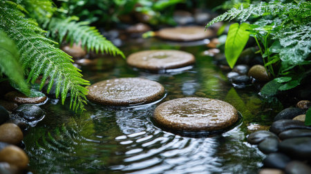 A serene stream flows through a lush forest, featuring moss-covered stepping stones. This tranquil scene reflects nature's beauty and offers a peaceful escape.