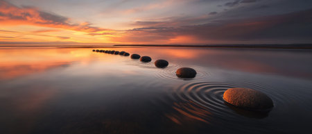 A serene scene of a row of smooth stones placed in the water, creating ripples that radiate outwards as if they were seen from above, symbolizing peace and balance, with a tranquil sky at sunset in the background. --ar 7:3 --v 6.1 Job ID: 41e593f2-d1af-4639-b86e-0382c0c98fba